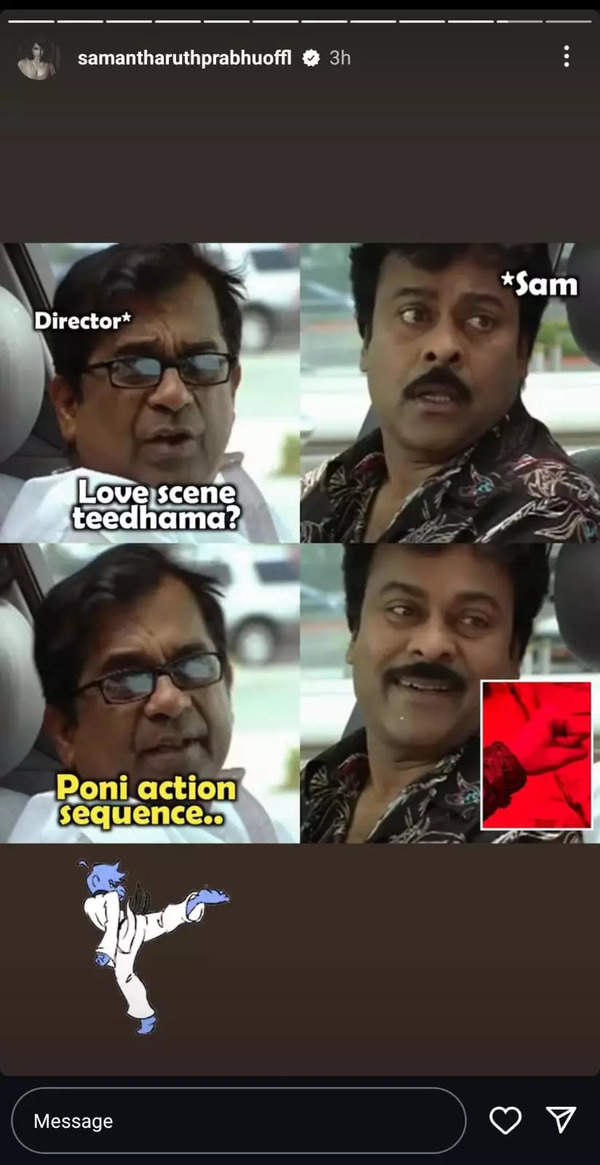 What grabbed fans’ attention was her next post, which hilariously mocked her early career in romantic roles. She shared a meme featuring Chiranjeevi and Brahmanandam. In the meme, Brahmanandam asks, “Love scene teedhama (intense love scene?)” to which Chiranjeevi responds with a nervous face. When Brahmanandam suggests an action sequence instead, Chiranjeevi reacts with enthusiasm. Samantha labeled Chiranjeevi as herself and Brahmanandam as the director.
